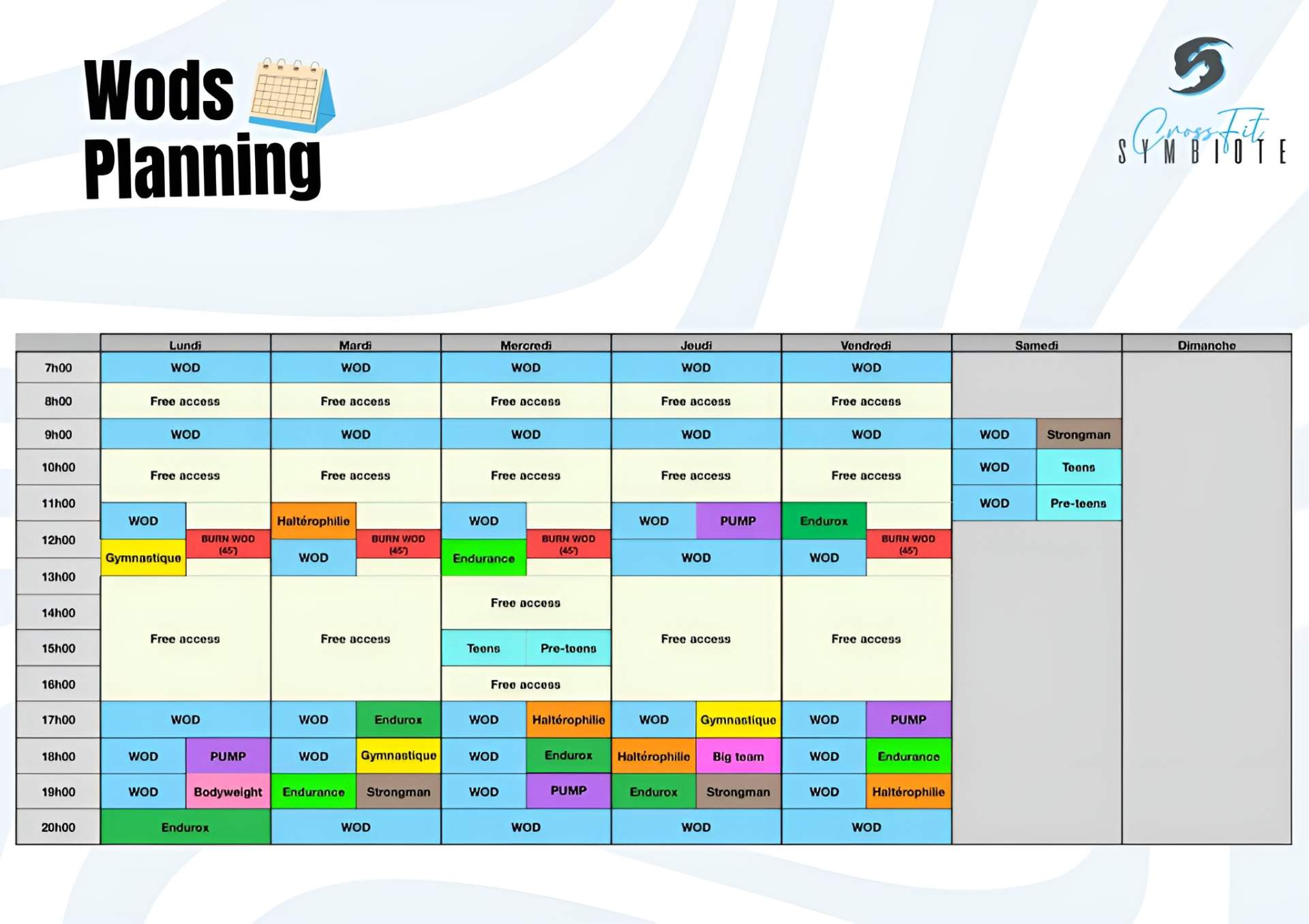 Crossfit Symbiote propose un planning de cours très variés du lundi au samedi. Que vous soyez un adepte du cardio, de la musculation ou des cours collectifs, nous répondons à toutes vos demandes. Nous proposons une variété de plages horaires adaptées à tous les emplois du temps, du matin au soir, pour que vous puissiez vous entraîner à votre rythme. Grâce à notre système de réservation en ligne intuitif, vous pouvez réserver vos créneaux à l'avance, garantissant ainsi votre place aux cours les plus populaires.